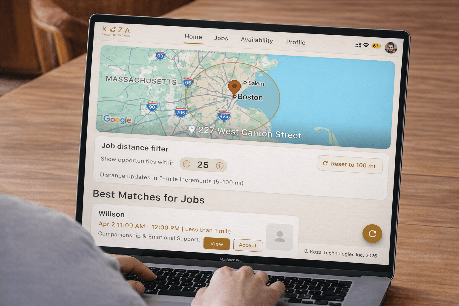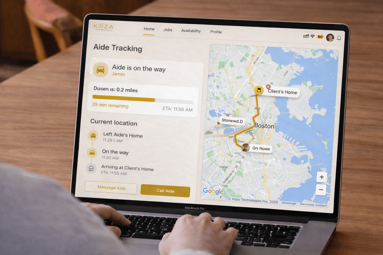 Koza goes beyond simple bookings: it anticipates daily care needs, intelligently matches people and aides with empathy, accurately tracks aide's services, supports agencies and aides and ensures trust for everyone involved.